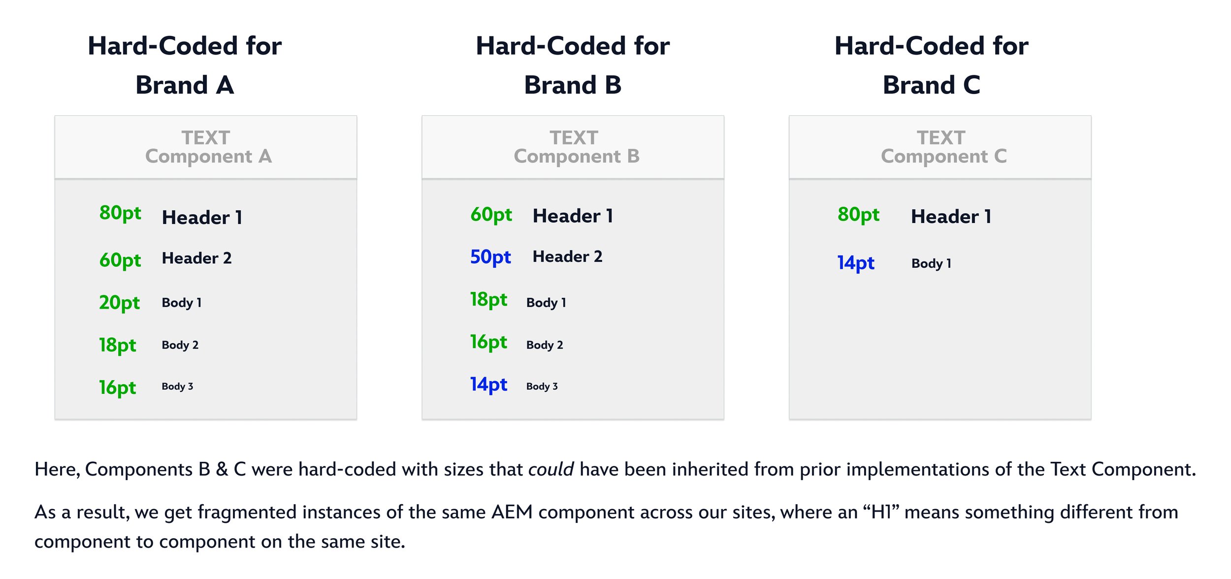 Today, we are seeing instances where components are using hard-coded text styles (sizes, weights, colors), with variations appearing on an ad-hoc basis.