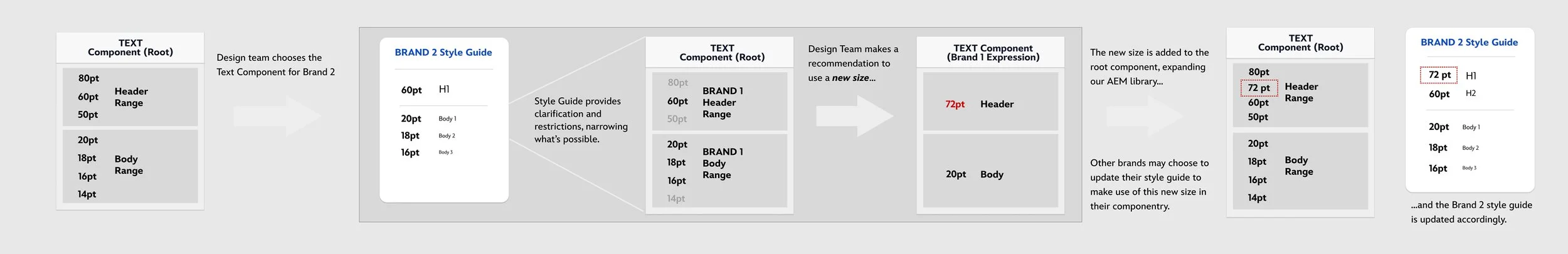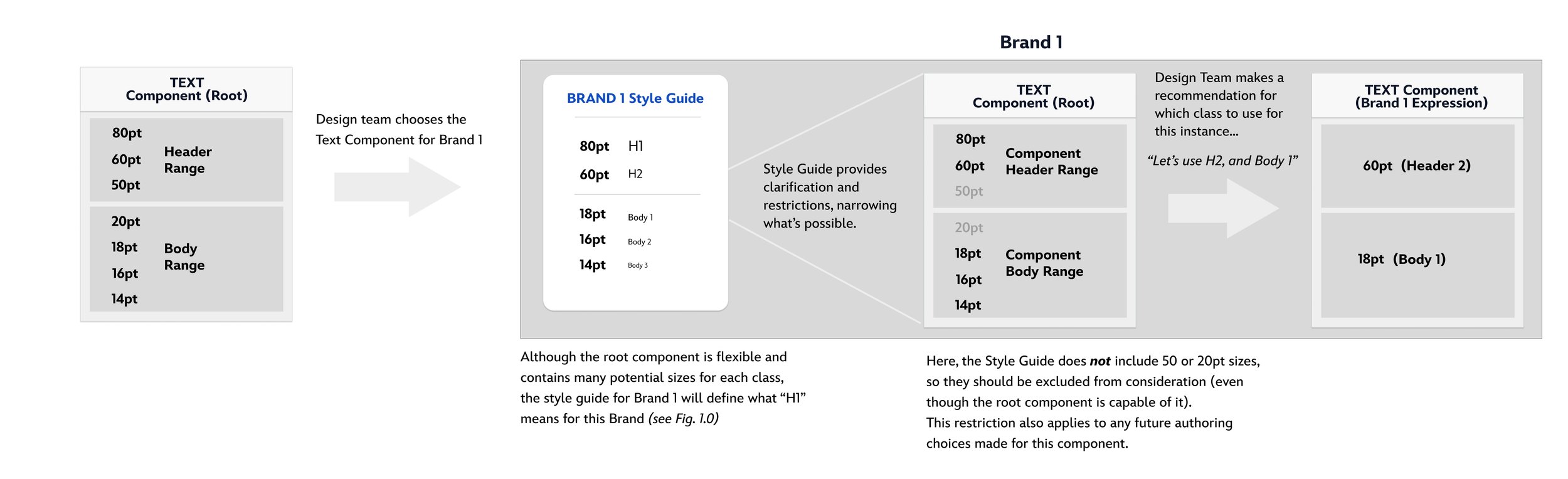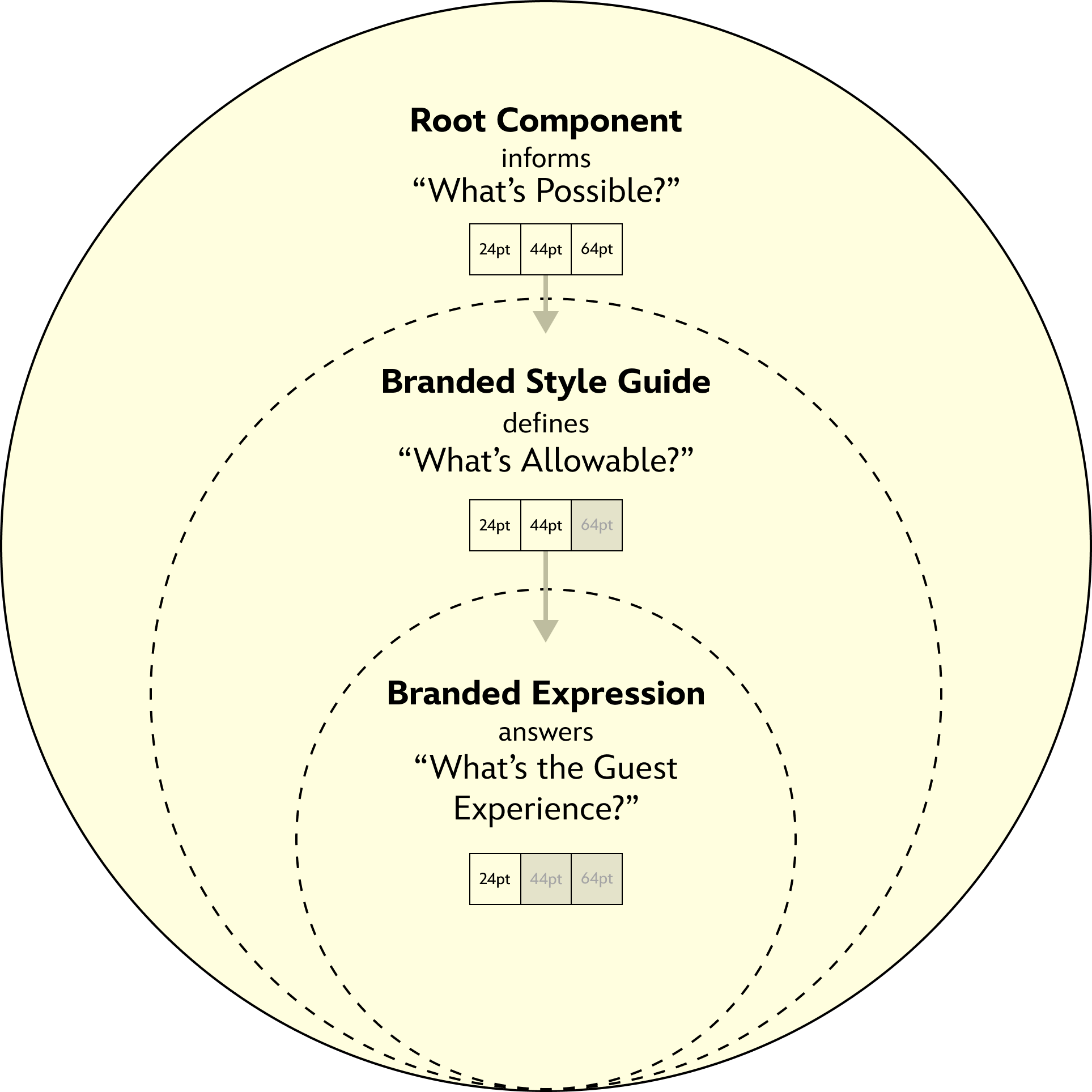 The relationship between a Root Component and the final Brand Expression of that component involves a set of narrowing options in the form of style guides and design choices– all tailor-made by the Design Team to fit that particular Brand.