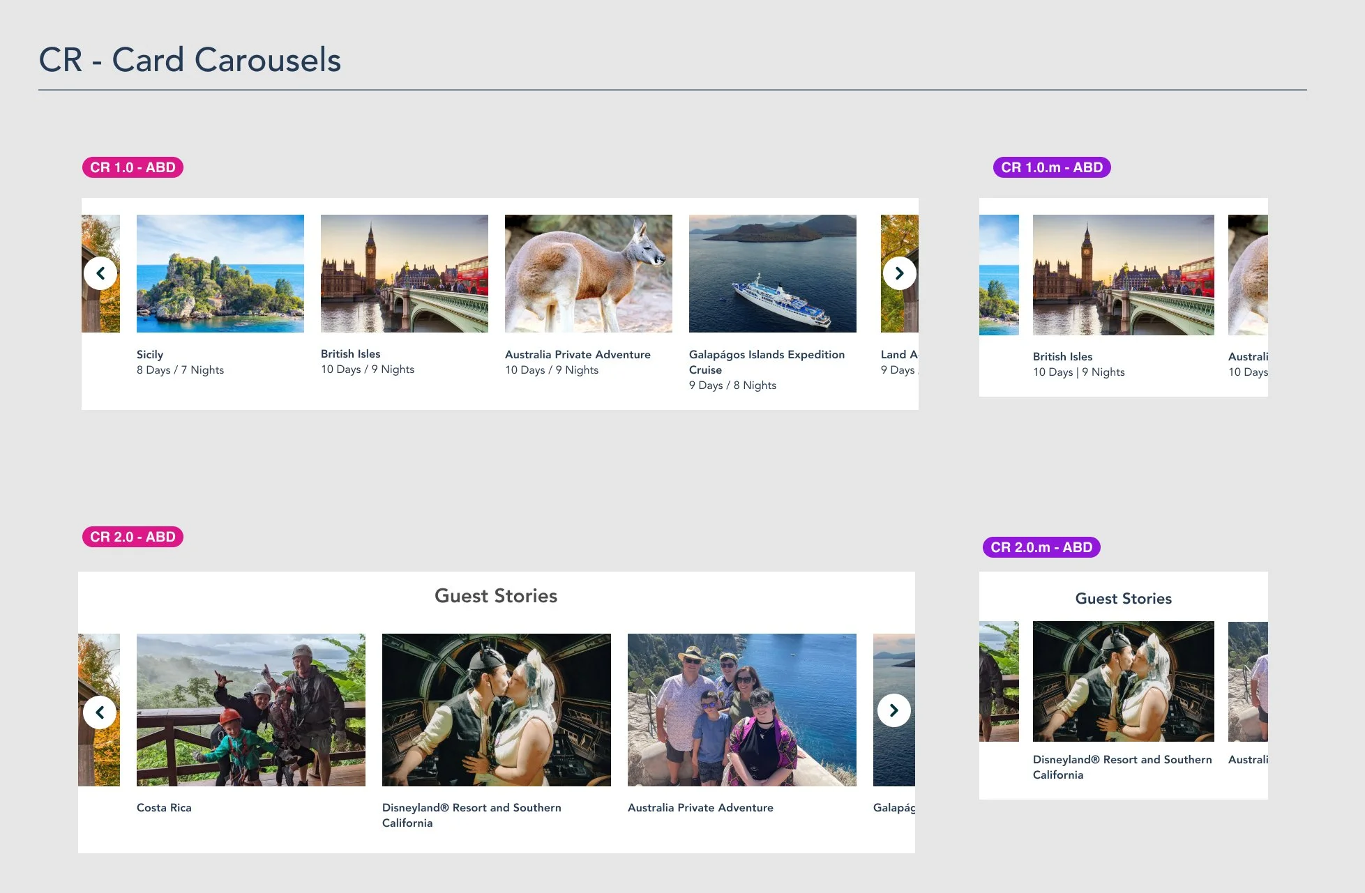 For all brands, I usually started with the Homepage, Itinerary (ABD + NatGeo) or About page (Disney Institute), and continued from there. After designing components for large/main pages, I would then focus on growing the component library/ mini-design system, adding individual components as needed.