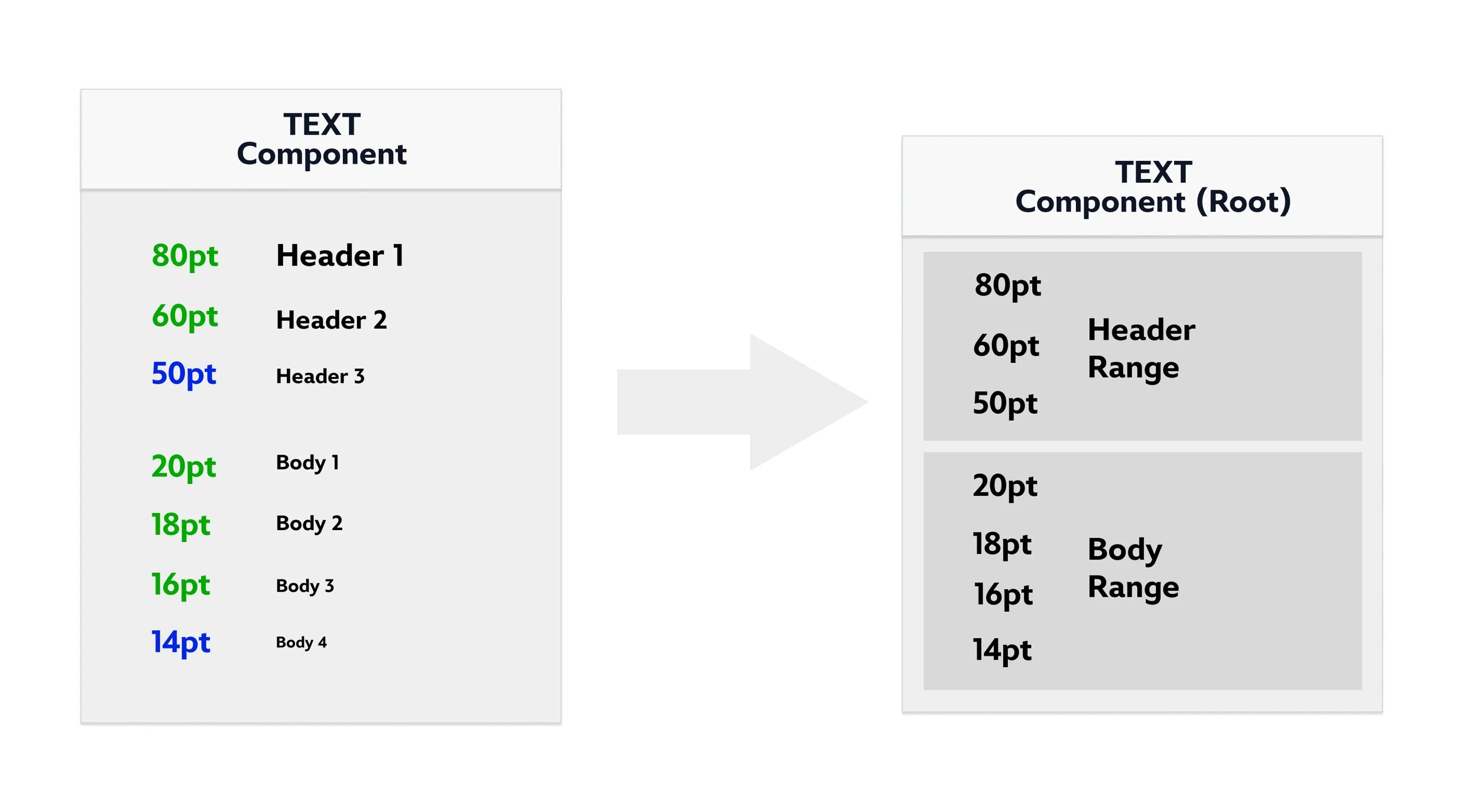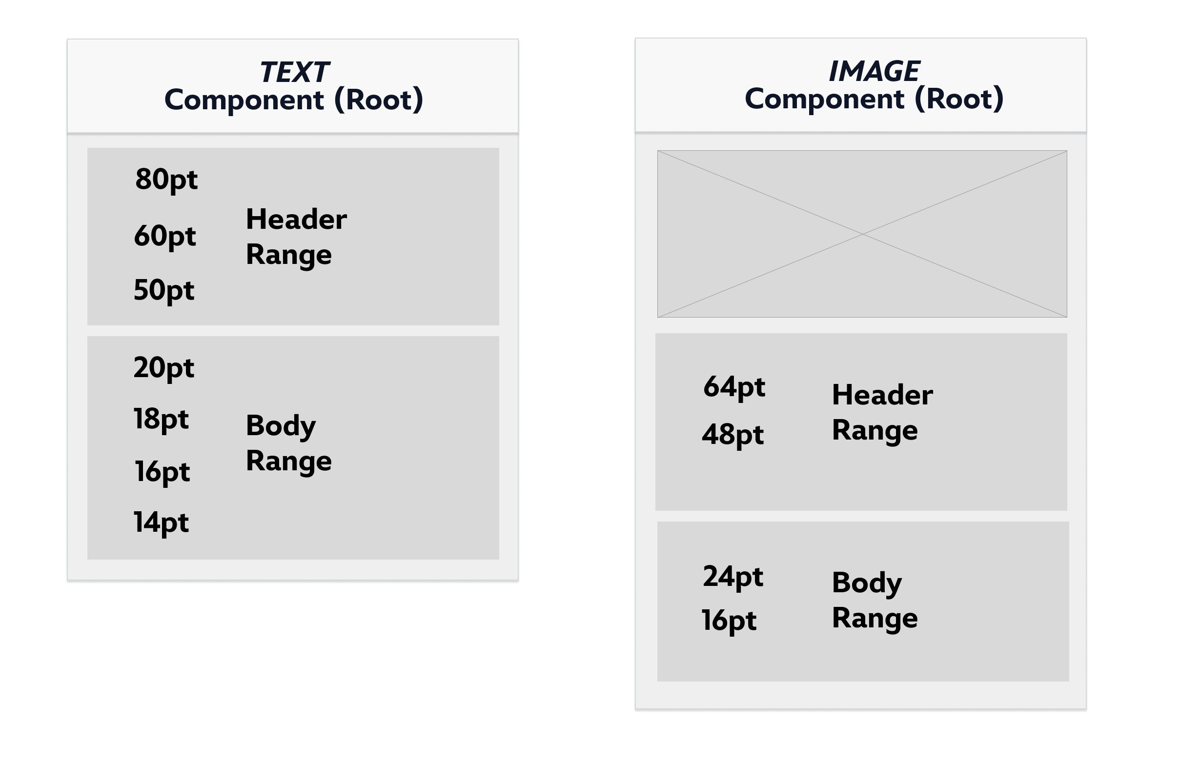We should combine all possible text sizes into a range of options that will correspond to a class of text (H1, H2, Subheader 1, Subheader 2, Body 1, etc.). These ranges would be defined at the root component level and as point sizes– agnostic of class.