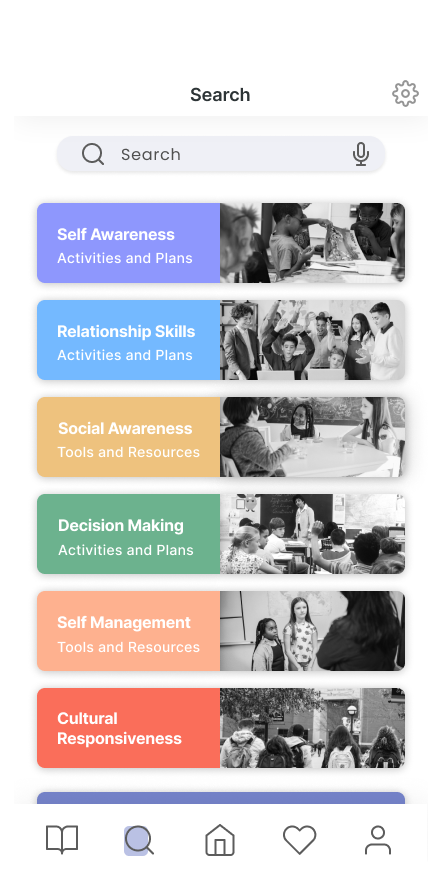 When building on the visual design, we wanted to maintain a playful, endearing tone as the application was geared towards teachers and guardians for elementary school students. With the amount of content categories there were for activities and lesson plans, we decide to color code each SEL category as an additional grouping method (aside from the main search filter) for users to lean on. Our color coding/visual style was our most consistently positive feedback from user testing!